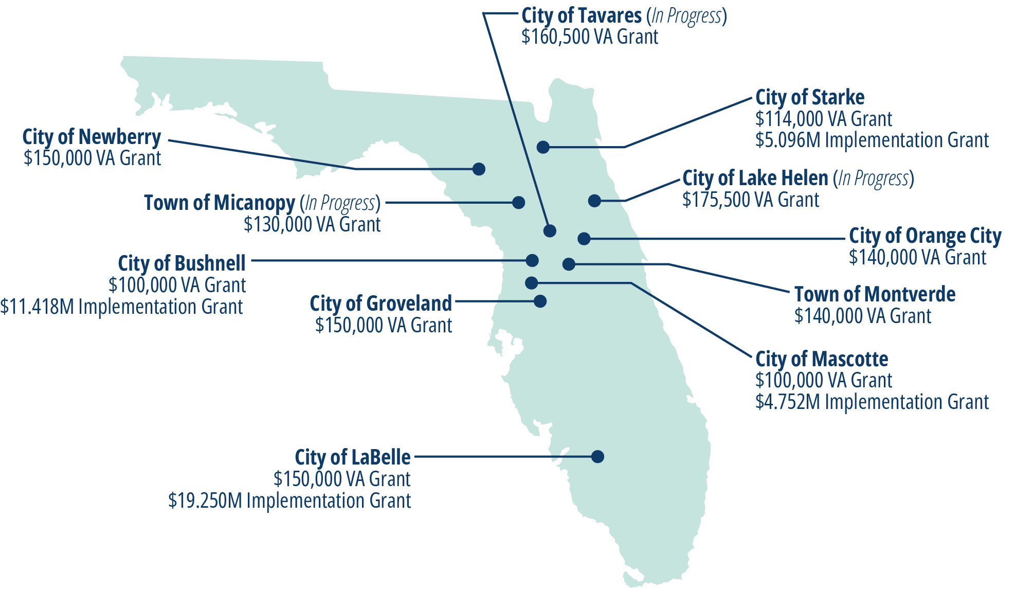 Similarly, the city of Starke identified critical wastewater infrastructure at significant risk of inundation along the Alligator Creek basin and within the downtown corridor, where storm-induced flooding and stormwater runoff have repeatedly threatened the reliability of the city’s wastewater collection system. To address these issues, Starke applied for and received $5.096 million for pre-construction and construction of system improvements to several wastewater lift stations that will protect essential public services, reduce environmental and public health risks, and ensure long-term system resiliency. The scope of the project includes adaptation measures such as elevating electrical and mechanical components, installing floodproofing systems, relocating facilities away from high flood-risk zones, improving access to facilities, and providing reliable backup power.